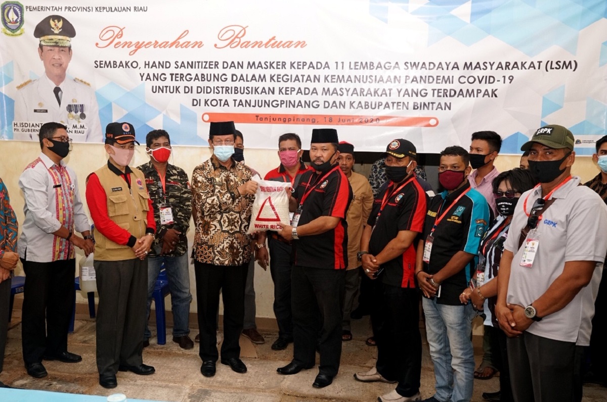 Bintan, MR– Plt. Gubernur Kepri H. Isdianto yang juga ketua Tim GugusbTugas Covid-19 Kepri menyerahkan bantuan sembako, hand sanitizer, dan masker kepada 11 Lembaga Swadaya Masyarakat (LSM) yang tergabung dalam kegiatan kemanusiaan Pandemi Covid-19. Bantuan ini kemudian untuk didistribusikan kepada masyarakat yang terdampak di Kota Tanjungpinang dan Kabupaten Bintan.