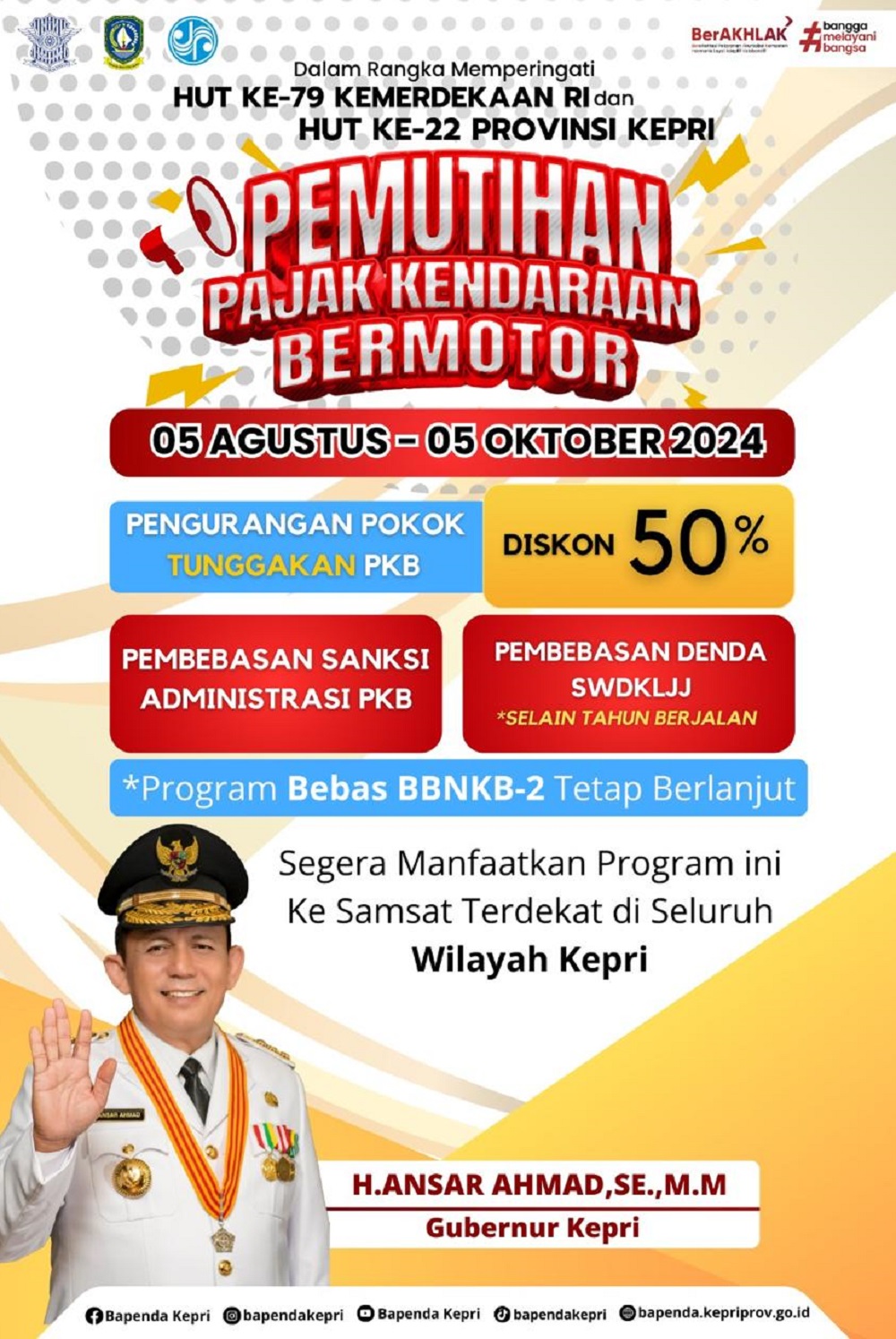 Tanjungpinang, mejaredaksi – Gubernur Kepri, Ansar Ahmad telah menyetujui Program Pemutihan Pajak Kendaraan Bermotor (PKB). Program ini menawarkan pengurangan sebesar 50 persen pada pokok tunggakan pajak kendaraan bermotor.
