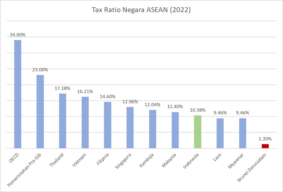 Bisa dilihat bahwa tax ratio Indonesia dapat dikategorikan rendah jika dibandingkan dengan tax ratio negara ASEAN (pada tahun 2022) sebagai negara yang berada di satu wilayah yang sama. Indonesia hanya mengungguli Laos dan Myanmar. Adapun Brunei Darussalam tidak relevan untuk diperhatikan karena negaranya terkenal mengandalkan sektor migas dan industri dalam negeri untuk pendapatannya.
