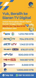 Jakarta, MR – Pemerintah terus berkomitmen memberikan kemudahan bagi masyarkat untuk beralih ke layanan TV Digital. Komitmen tersebut dibuktikan dari dibagikan nya secara gratis alat set top box (STB) kepada masyarakat rumah tangga miskin agar bisa menikmati siaran TV digital.