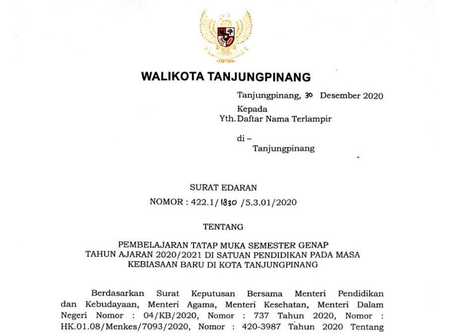 Pemberlakuan belajar tatap muka di Tanjungpinang itu berdasarkan Surat Edaran (SE) Walikota setempat, No 422.1/1830/5.3.01/2020. Dalam SE itu menyebut bahwa jika ada warga sekolah terinvekasi corona, maka akan dilaksanakan penutupan pembelajaran tatap muka dan kembali menerapkan pembelajaran Daring.