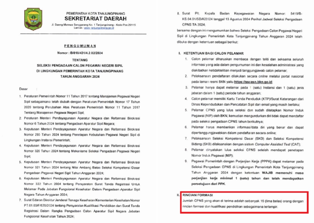 Tanjungpinang, mejaredaksi – Kota Tanjungpinang, Kepulauan Riau, hanya mendapatkan kuota penerimaan Calon Pegawai Negeri Sipil (CPNS) tahun 2024 sebanyak 15 orang. Kuota tersebut seluruhnya dialokasikan untuk formasi dokter.