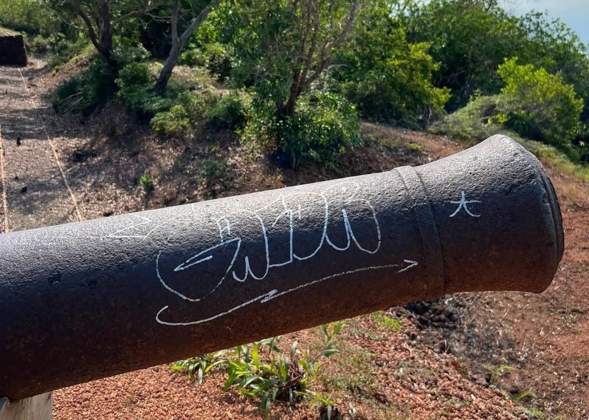 Tanjungpinang, mejaredaksi – Salah satu meriam tua peninggalan Kesultanan Riau-Lingga di Benteng Bukit Kursi, Pulau Penyengat, Kota Tanjungpinang, menjadi korban vandalisme. Coretan berwarna putih yang mencolok terlihat jelas di laras meriam yang menghadap ke laut, menodai permukaan besi.
